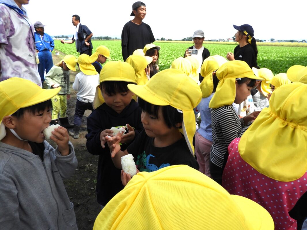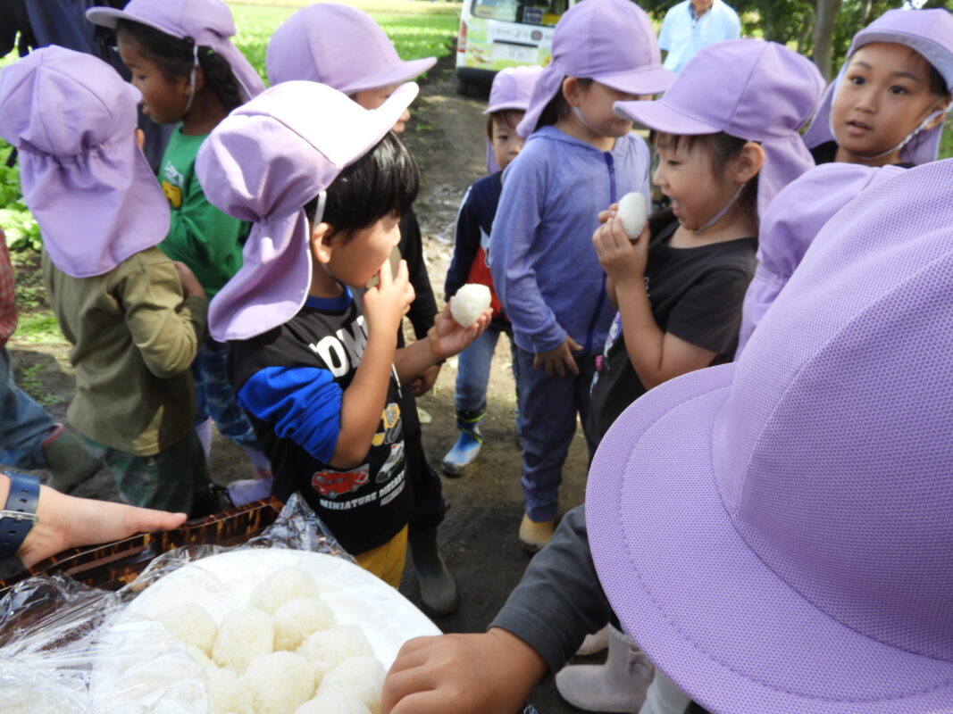 教師やお手伝いのおうちの方と一緒に一人2束収穫したのですが、子どもたちは初めて扱う鎌に少し緊張した様子。「こんな風にやるんだね」「なんかちょっと難しかった!」と新たな発見と農家の皆さんの苦労も感じたようです。稲刈り後はおいしいおにぎりもいただきました。「甘くておいしい!」と大喜びで、夢中で食べていた子どもたちです。