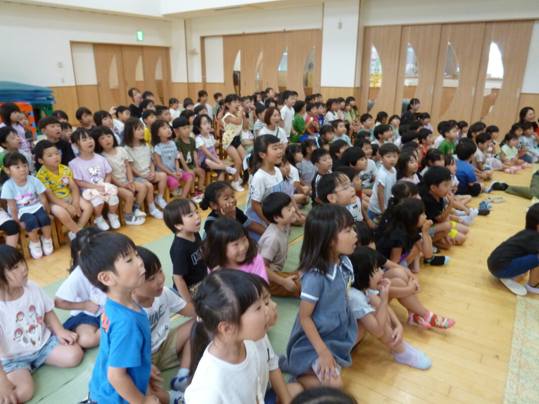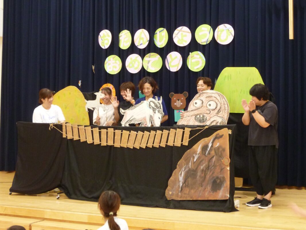 8月は、教師による「がらがらどん」のペープサートでした。「〇〇先生の声だ~」と耳を澄まして聞き大喜びしてくれました。
