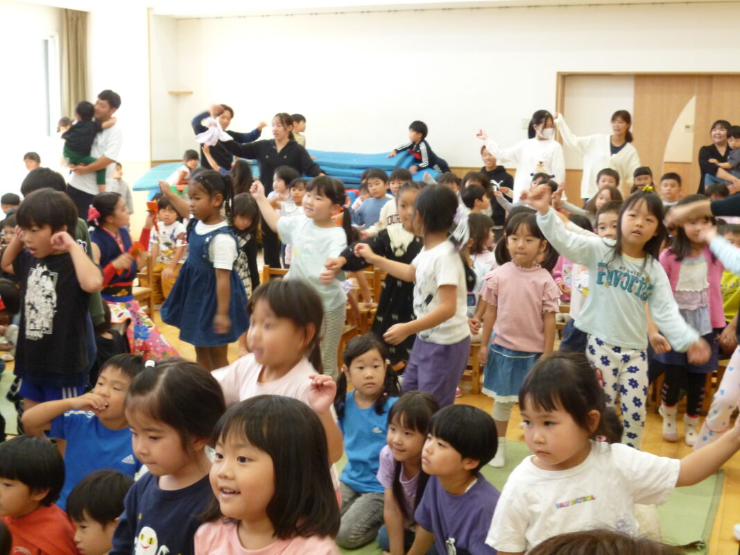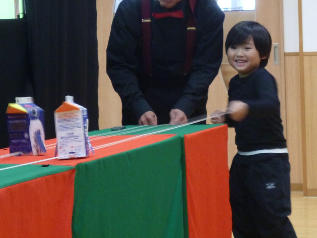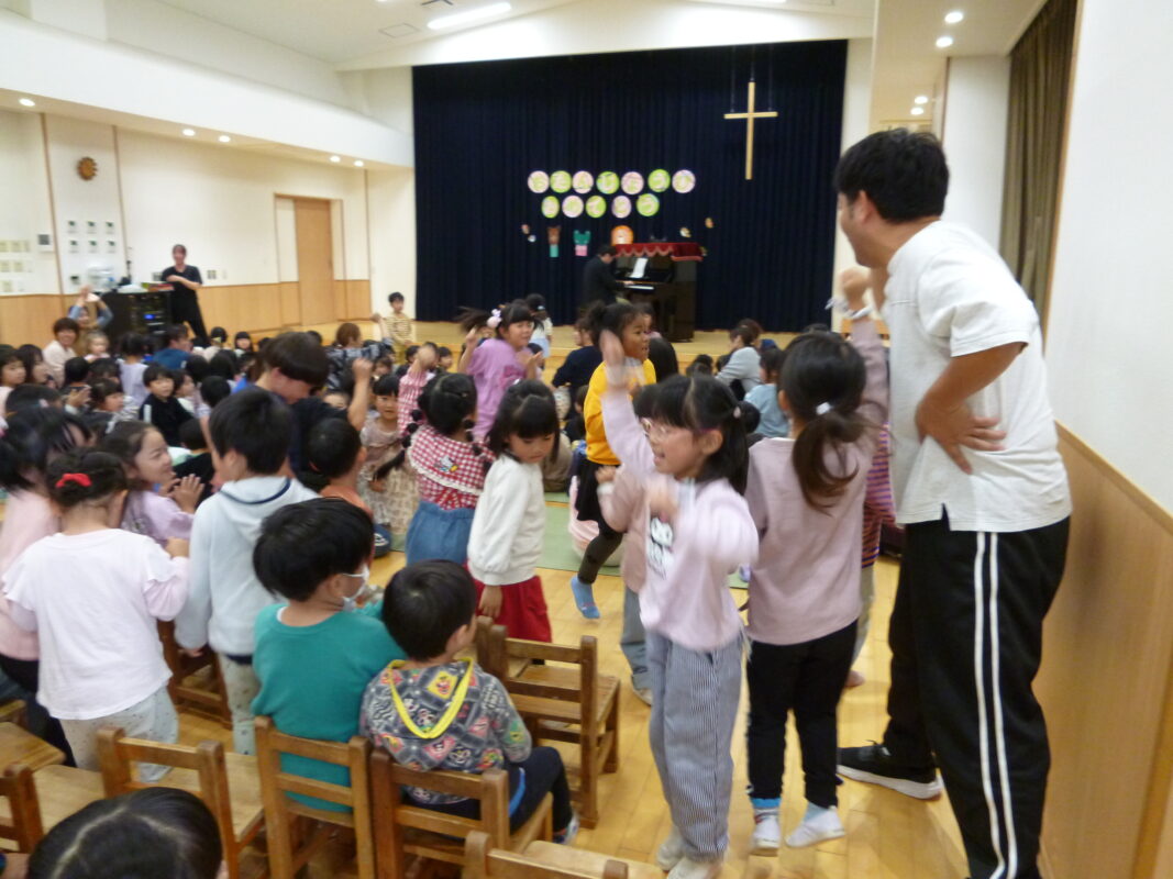 10月は卒園児の方がピアノ演奏をしながらイントロクイズ、11月のゲストは、影絵劇の「クレヨンカンパニー」さんでした。ペンギンくんがお友だちと繰り広げる世界にみんな真剣な表情でした。